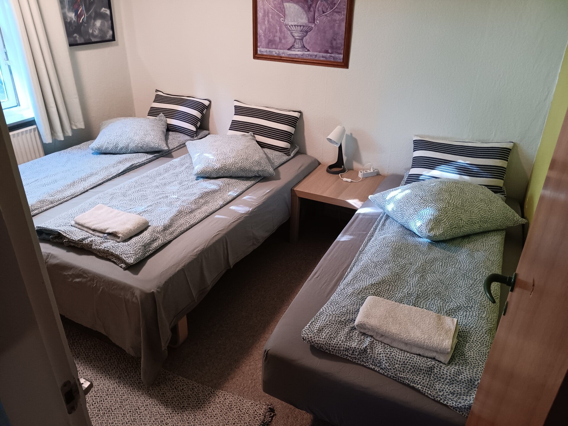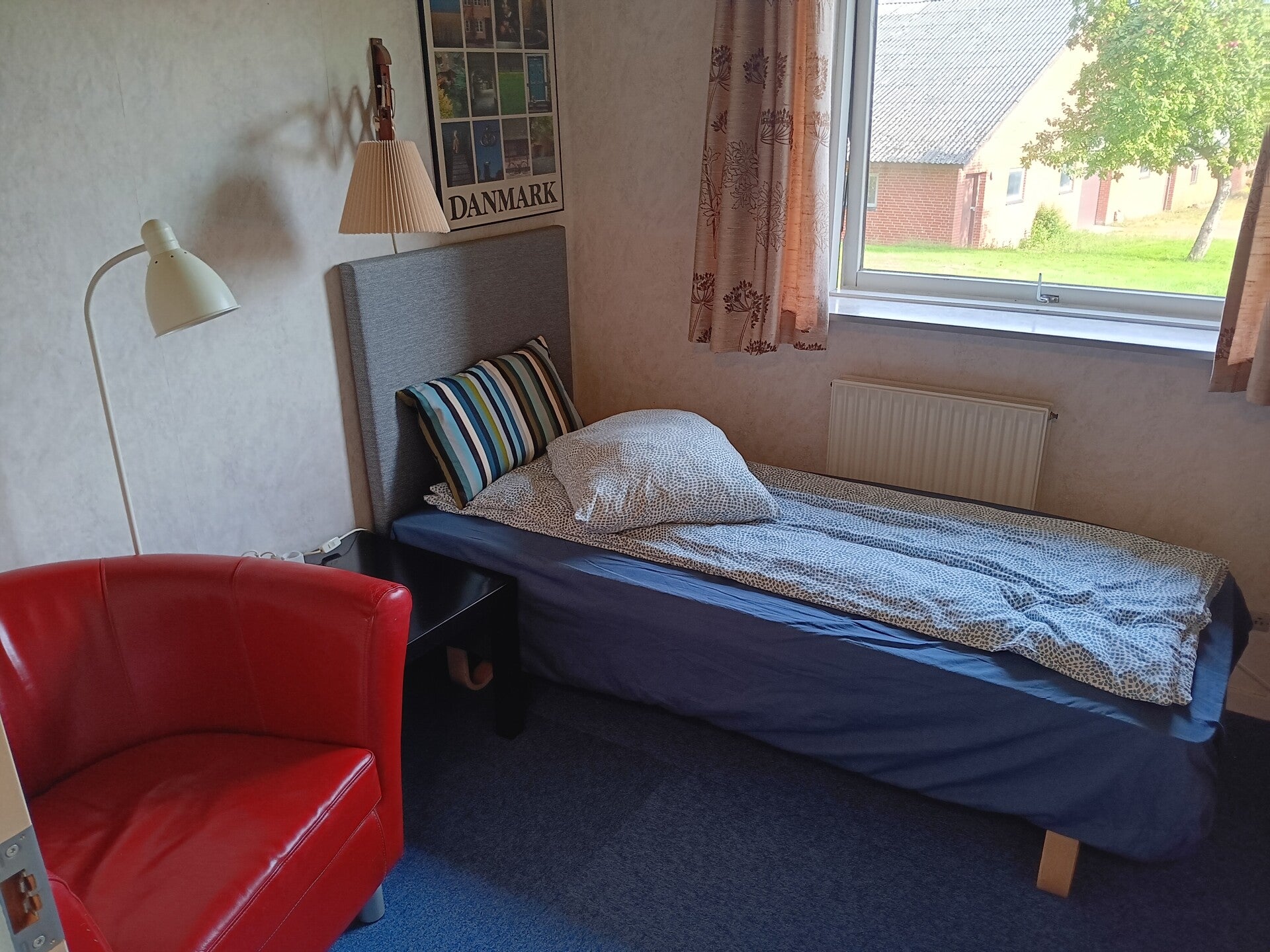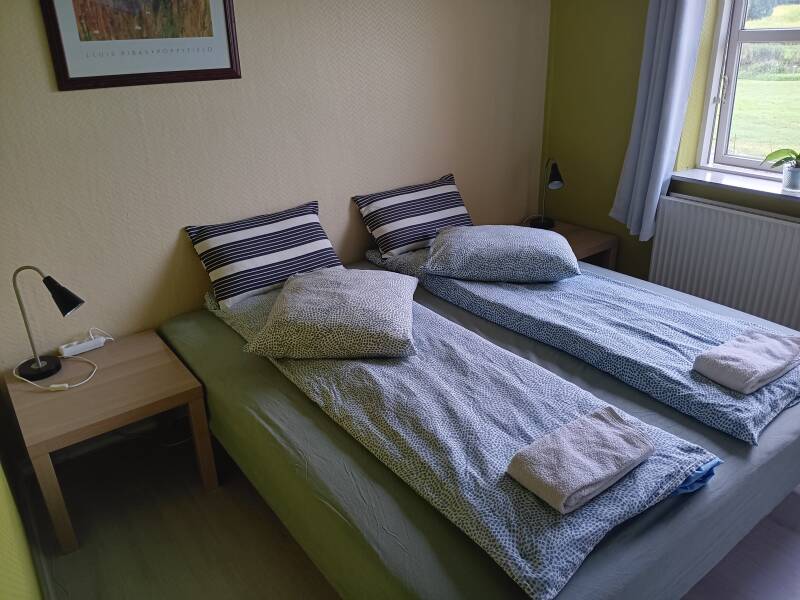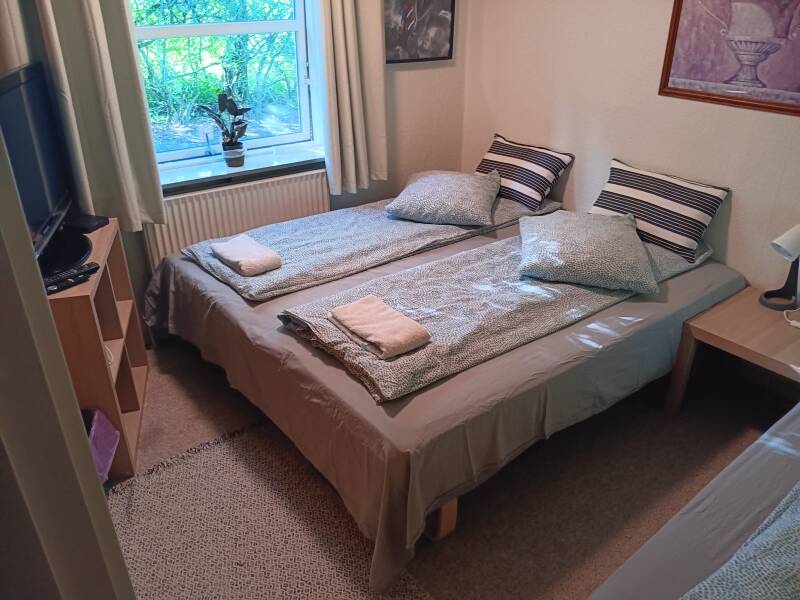 Med dobbelt seng eller 2 senge. Ingen særlig udsigt. Der kan være 3 personer, men der er så mindre plads.