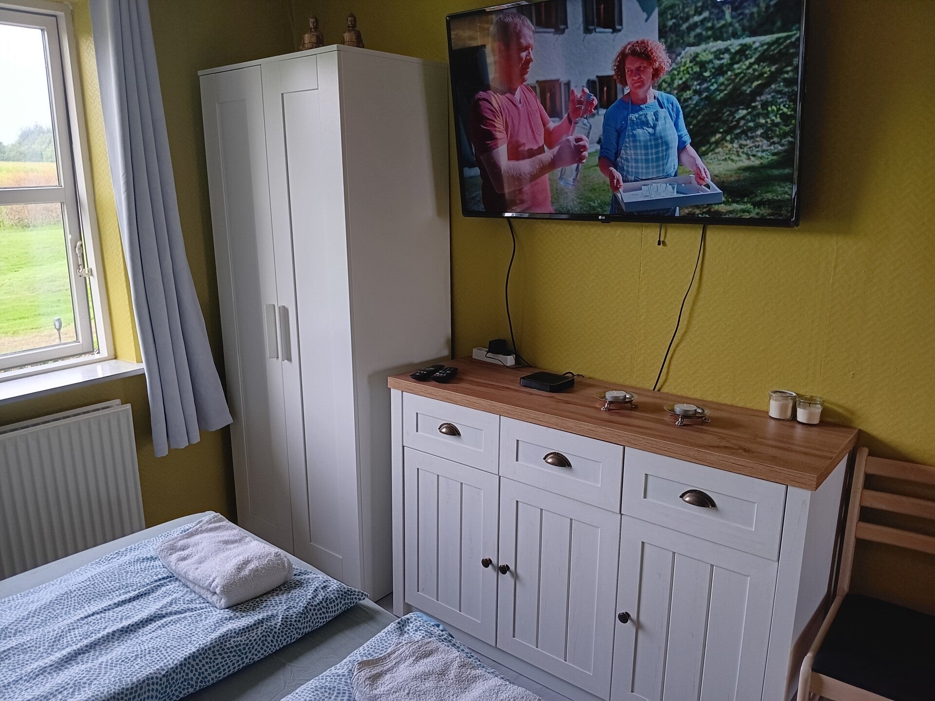 Lille simpelt enkelt værelse med tv.
